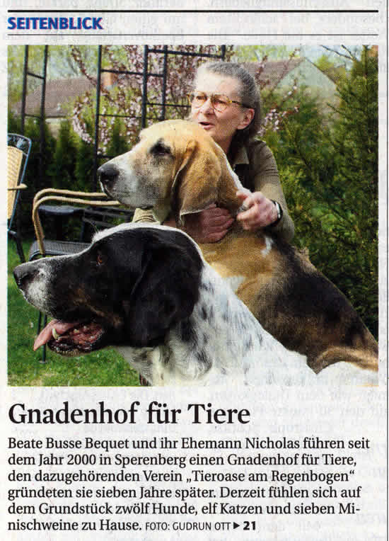 Ihre Wahl fiel auf den Verein „Tieroase am Regenbogen e.V.“, der in Sperenberg einen Gnadenhof für Tiere hat. Auf dem Gnadenhof von Beate Busse Bequet und ihrem Mann Nick Bequet in Sperenberg leben Hunde, Katzen und Minischweine. Viele der Tiere sind ehemalige Versuchstiere, doch auch andere alte, behinderte oder kranke Tiere leben hier.